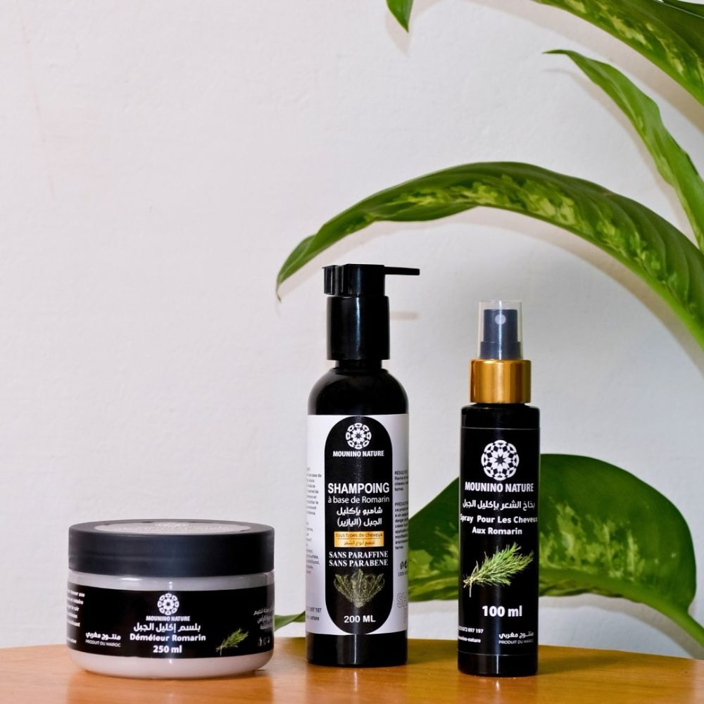 Discover natural luxury with the ‘shampoo, detangler and spray’ pack from Mounino Nature. Enriched with pure rosemary oil, free of parabens and sulfates, for healthy, soft hair